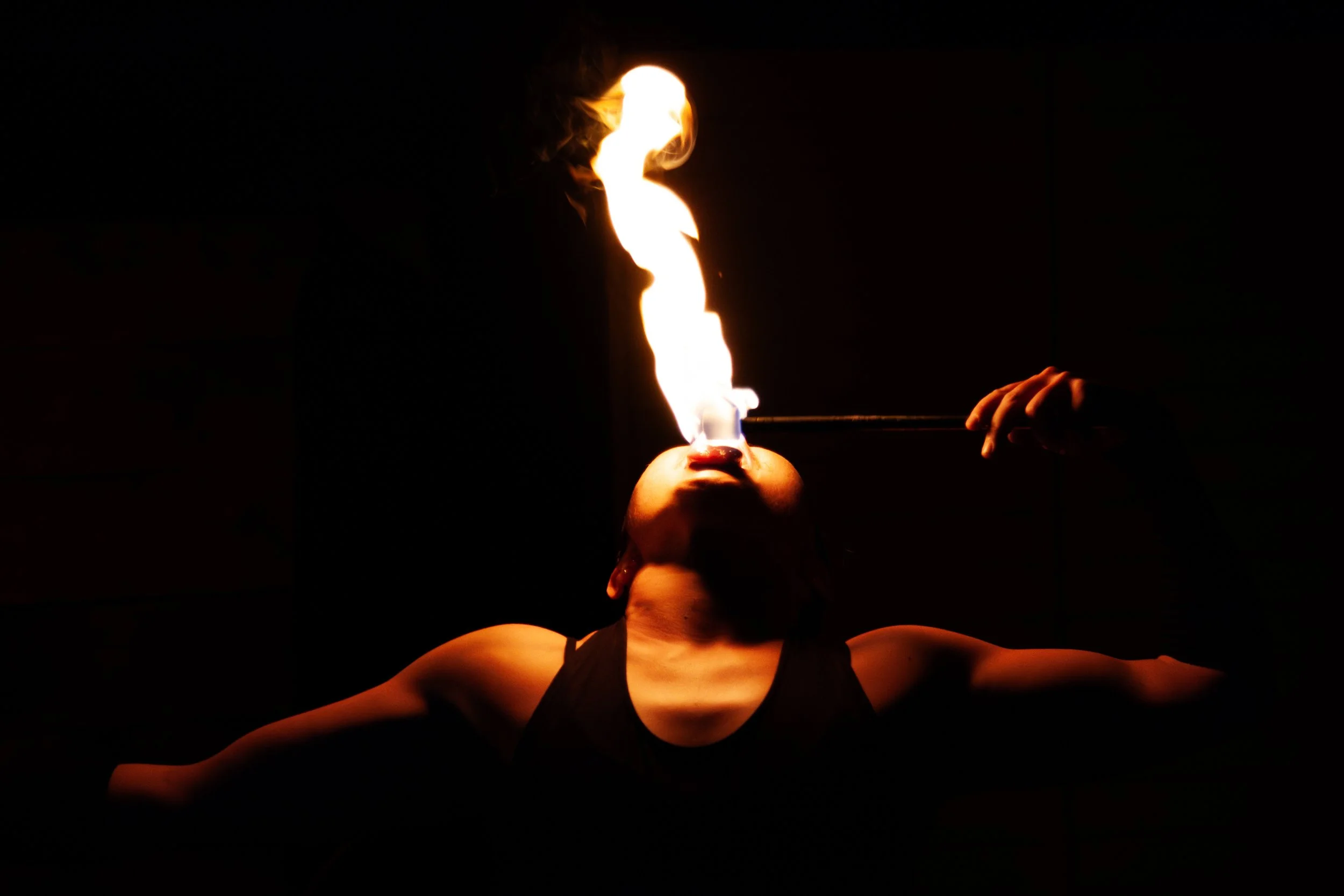 Ro is fully insured to provide high quality fire entertainment. Imagine greeting your guests in style with fire eating and feats of body burning? Or perhaps you are looking for a fire flow show to leave your guests speechless? Get in touch to discuss your requirements. Please note, fire performances are subject to appropriate space and safety measures. Not all characters are available with fire due to safety.